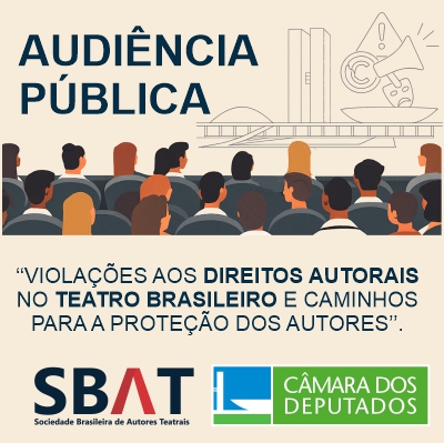A SBAT – Sociedade Brasileira de Autores Teatrais participou da Audiência Pública “Violações aos Direitos Autorais no Teatro Brasileiro e Caminhos para a Proteção dos Autores”, que aconteceu no dia 26 de agosto de 2025, às 10 horas da manhã, na Câmara dos Deputados, em Brasília – DF. Na ocasião, representada por um dos seus Coordenadores Provisórios, Gillray Coutinho, e pelo advogado e colaborador da Sociedade, Alexandre Negreiros, perito em direitos autorais e compositor, a SBAT apresentou diversos problemas encontrados no atual sistema de autorização, recolhimento e distribuição de direitos autorais no setor e sugestões para melhorar esse ambiente de negócios. A saída passa, a nosso ver, pelo fortalecimento da atuação das associações de gestão coletiva de direitos teatrais. Do encontro também participaram os Deputados Federais Tadeu Veneri (PT/PR), Reimont (PT/RJ), Marissol Barbosa de Souza Pinheiro, diretora de Gestão Coletiva da Secretaria de Direitos Autorais e Intelectuais do Ministério da Cultura e Eloá Nascimento dos Santos, Assessora Técnica do Ministério do Trabalho e Emprego.